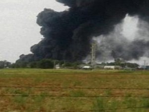 Same kind of thing happened in Texas at the Magnablend fracking chemical site http://www.texassharon.com/2011/10/03/the-fracking-chemical-plant-fire-in-waxahachie/