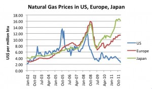 Selling natural gas overseas requires turning it into a liquid by cooling it to minus-260 degrees F, putting it in specially insulated Liquefied Natural Gas (LNG) ships, and then heating and re-gasifying it once it reaches its destination. The expense of re-gasification and shipping makes it easier and cheaper to sell gas in the U.S.instead, so why the sudden push to export LNG? Call it over production, low demand, or an “unusually warm winter” – there’s a glut on the market and that has driven prices to approximately $2.80/MMBtu. Much too low to drill economically, yet the Natural Gas Drillers must drill or risk losing leases on land they have already staked out. The more they drill, the bigger the glut and the lower the price. In comparison, natural gas prices are much higher in Japanand Europe.