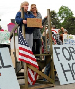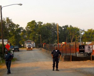 Hands Across Riverdale became the rallying cry on the ground, in the press, and in cyberspace uniting activists and residents in the defense of this community of 32 working class families and pensioners in resistance to Aqua America/PVR’S plan to construct a 3 million gallon per day water withdrawal for fracking operations near Jersey Shore, Pennsylvania. A plan approved by the Susquehanna River Basin Commission March 15th for the sale of the property, and June 7th for the construction of the transmission lines—both SRBC meetings nearly shut down by the OUTRAGED presence of nonviolent but righteous protesters. What began as a scattering of tents and sleeping bags amidst mobile homes—some occupied, some abandoned—quickly grew into one of the most vibrant democratically organized communities of resistance of which I have ever had the fortune to be a part. Among the residents Deb Eck and Kevin June deserve particular praise for their courage, their foresight, and their clear message that Riverdale was a community, that many residents owned their homes, that corporate interest is not an entitlement to eviction, and that you can’t simply bribe people out of their houses—especially when you insult them with an offer that makes it impossible for them to become anything but homeless.