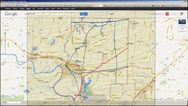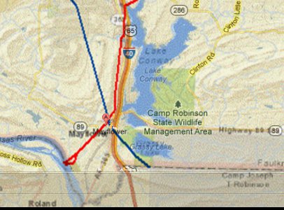 | Detail. Marker A is site of spill. The blue pipeline is natural gas. The red pipeline is the one that ruptured, called variously, the “Pegasus“, “Exxon Patoka - Corsicana“, or the MPLCO. |