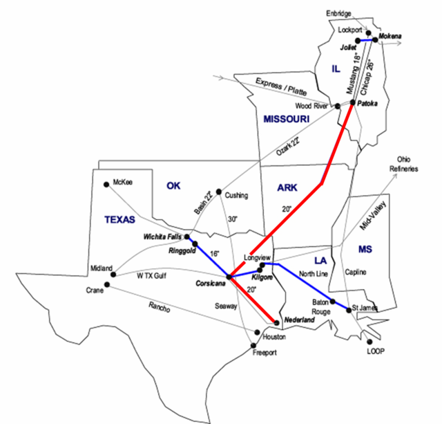 This ruptured 20-inch pipeline runs 858 miles from Patoka, Ill. to Nederland, Texas, and is called by several names, “Pegasus“, “Exxon Patoka - Corsicana” (NPMS/PHMSA) , and also by the partnership which operates it: Mobil Pipe Line Company (MPLCO).