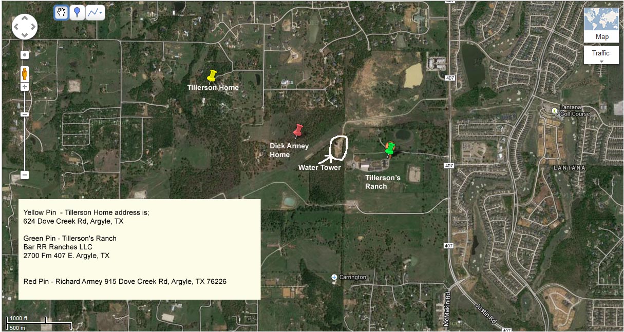 Later that year, the Armeys, the Tillersons and their co-plaintiffs sued Cross Timbers, saying that the company had promised them it wouldn’t build a tower near their properties. They also filed a brief in support of the town’s appeal. Last March, an appellate judge reversed the district judge’s decision saying he had overstepped his jurisdiction and sent the case back to the lower court, where it is pending. Meanwhile, the utility has reached out to Bartonville voters, who in November elected two members to the council who criticized the town’s fight against the tower, which would be located near Tillerson’s house, shown below: