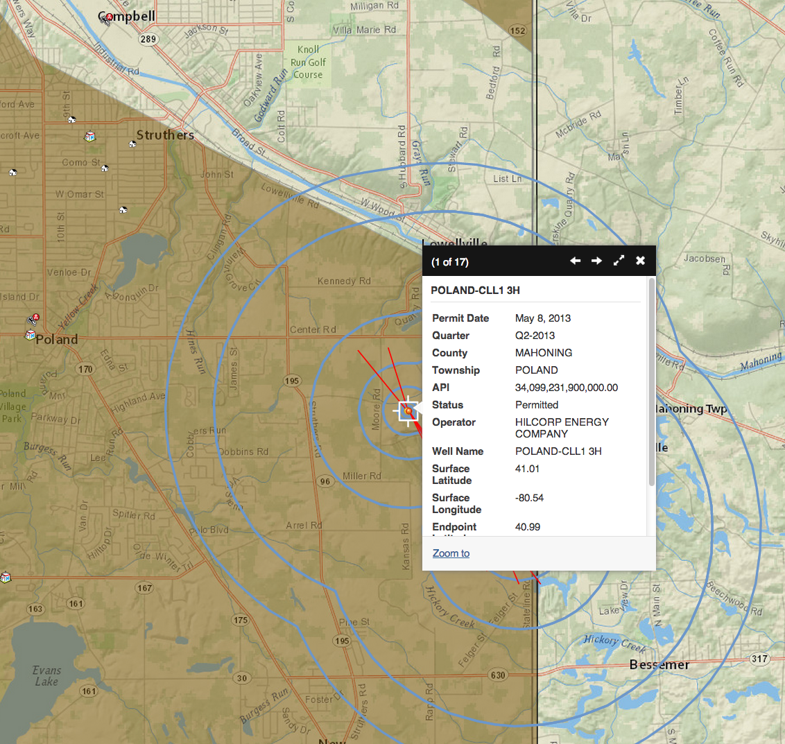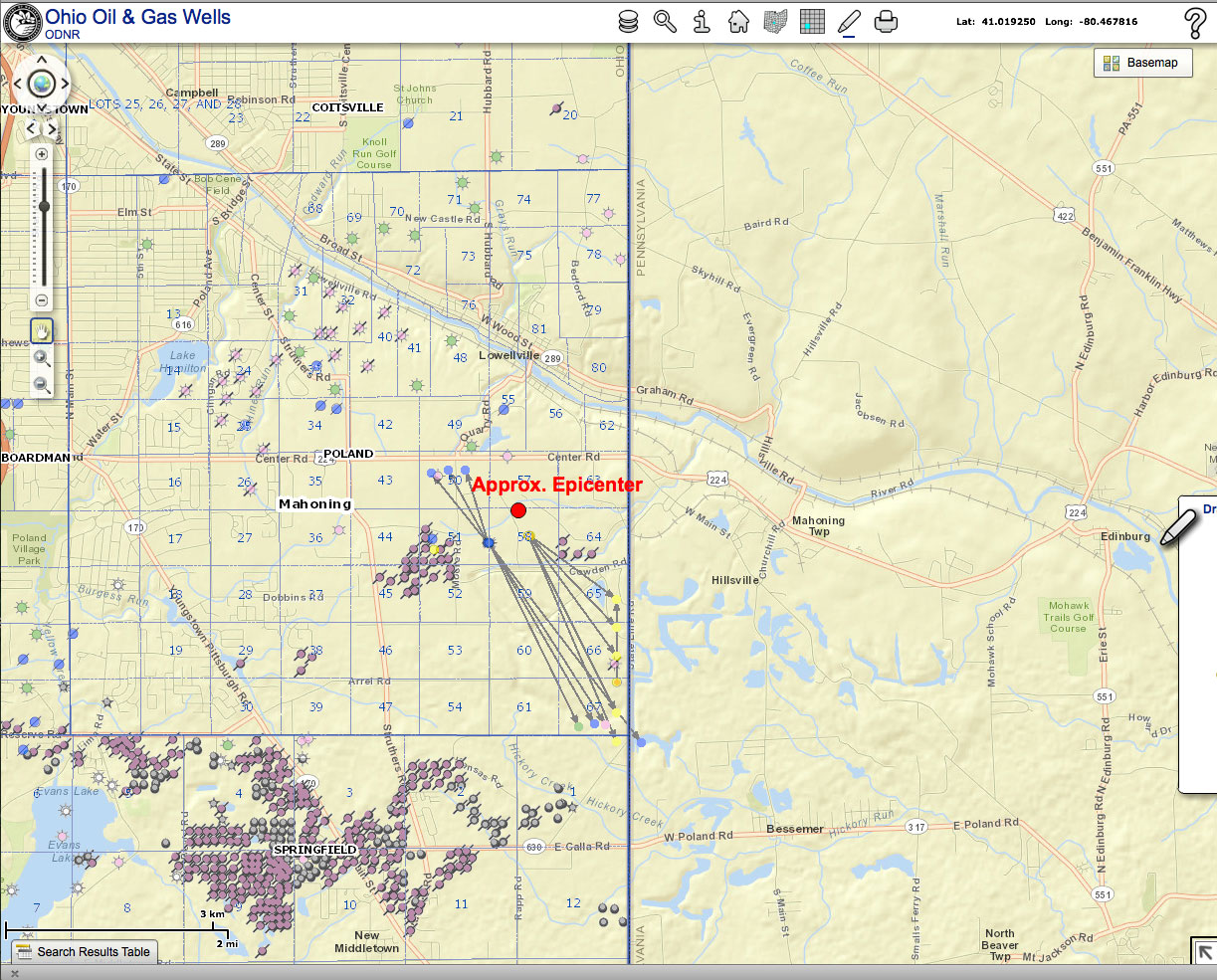 According to the USGS, the earthquake occurred at 2:26 a.m. one mile south of Lowellville. The agency pinpoints the epicenter at 41.017 N, 80.537 W, or roughly 2,000 feet northeast of Poland Township Park on land owned by Republic Services’ Carbon Limestone Landfill, where Hilcorp is developing 12 oil and gas wells in the Utica shale formation.