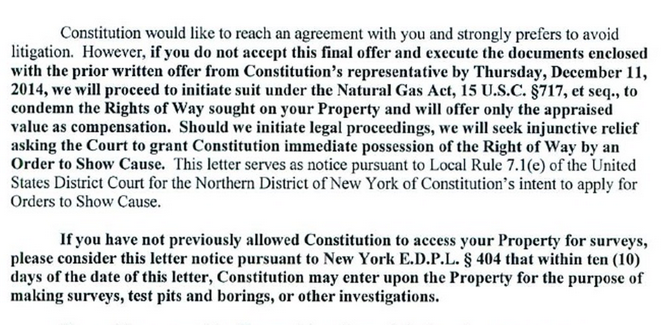 Constitution sent these threatening letters as if condemnation is something a landowner does not want. When it is exactly what the landowner should want: force the gasholes to condemn the property, since that is the most expensive way for the pipeline company to get ROW. The corollary of which is that forcing a condemnation is how the landowner gets the most money for their land.