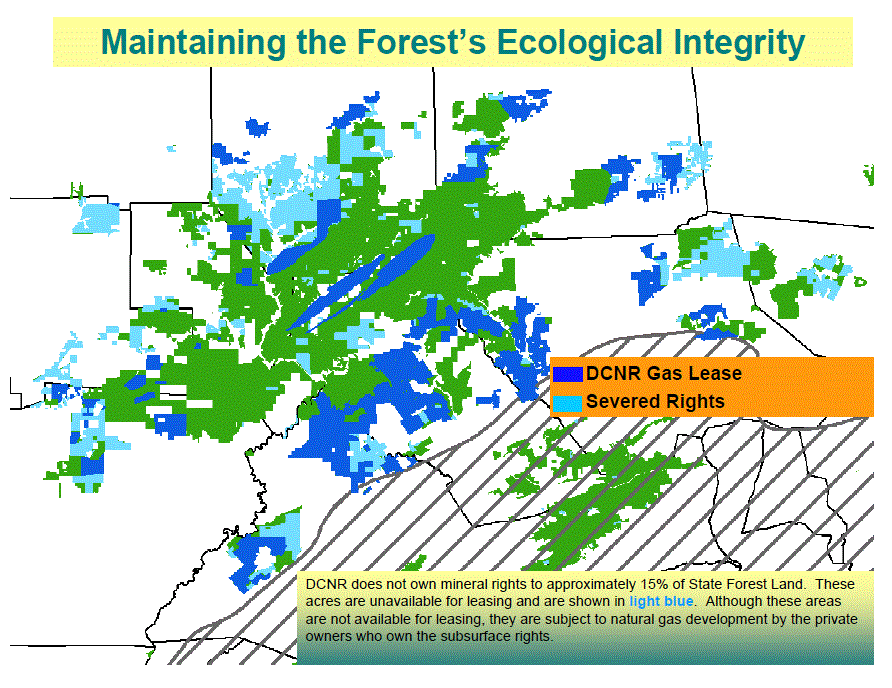 According to a DCNR powerpoint: Impacts of Leasing Additional State Forest for Natural Gas Development, approximately 700,000 acres of state forest land have been leased or severed. Severed lands are not available to leasing by DCNR, these are areas which are held by private owners who own the subsurface rights. See maps below.