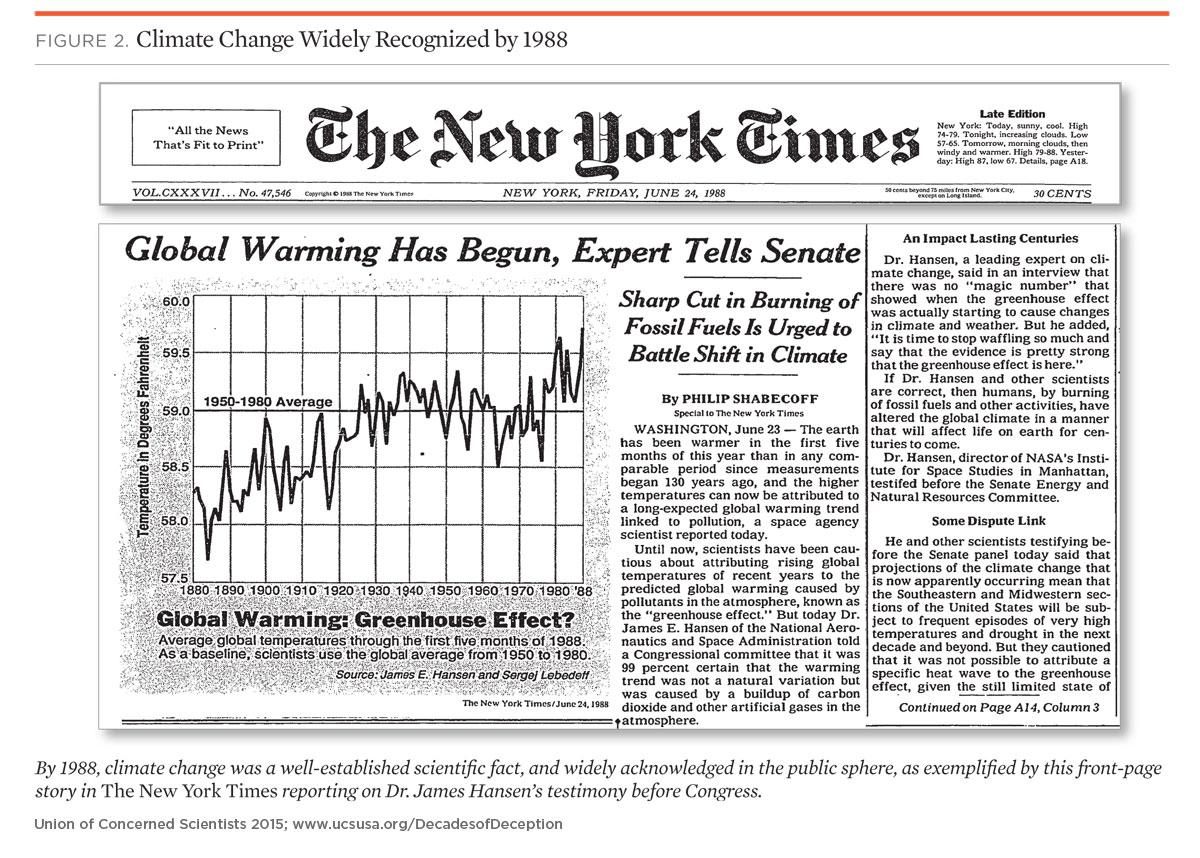 By 1988, climate change was a well-established scientific fact and widely acknowledged in the public sphere, as exemplified by this front page story in the New York Times. Enlarge image.