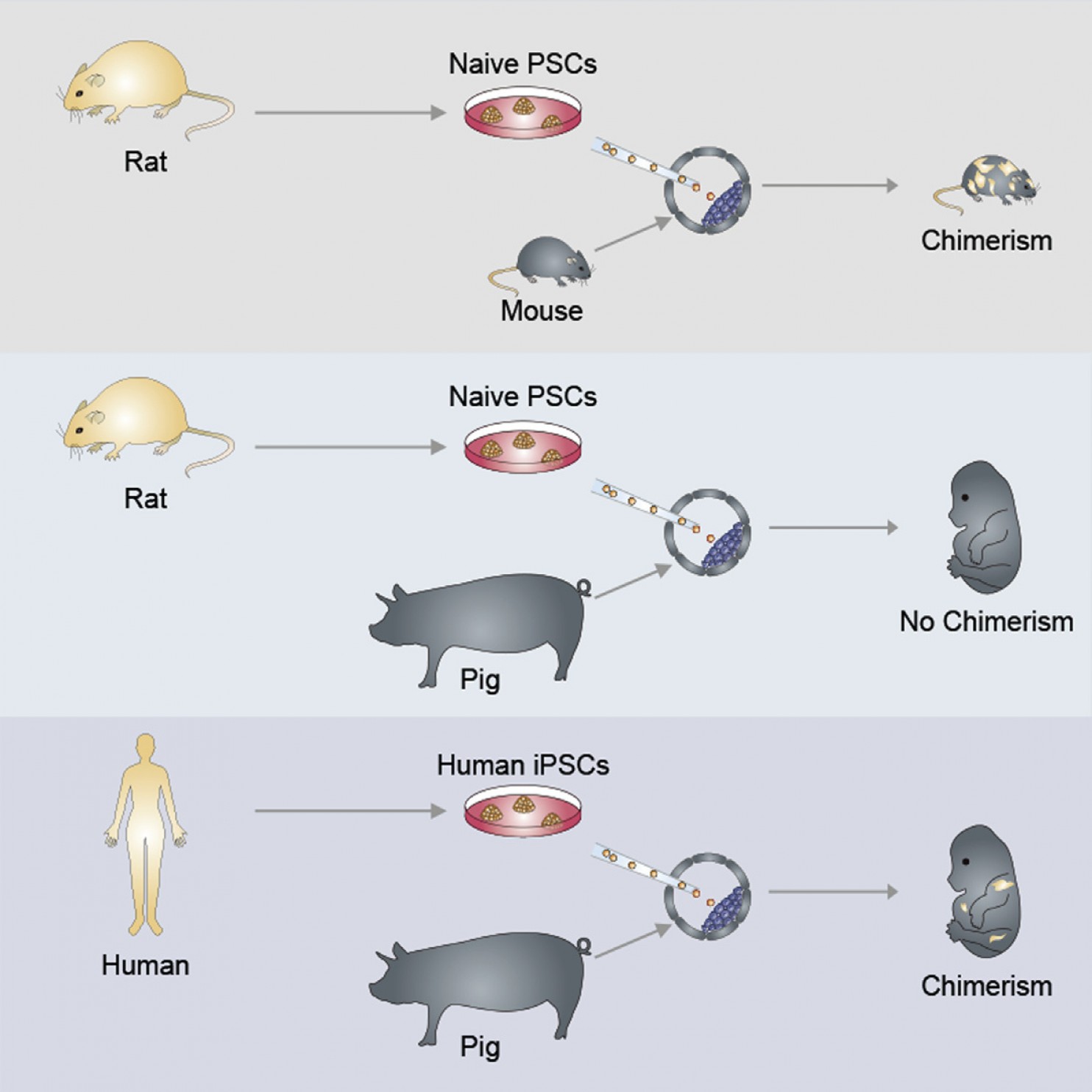 Though researchers have had great success producing rat-mouse chimeras (top), it has been more difficult to achieve chimerism with human and pig cells (bottom). (Wu et al./Cell 2017)