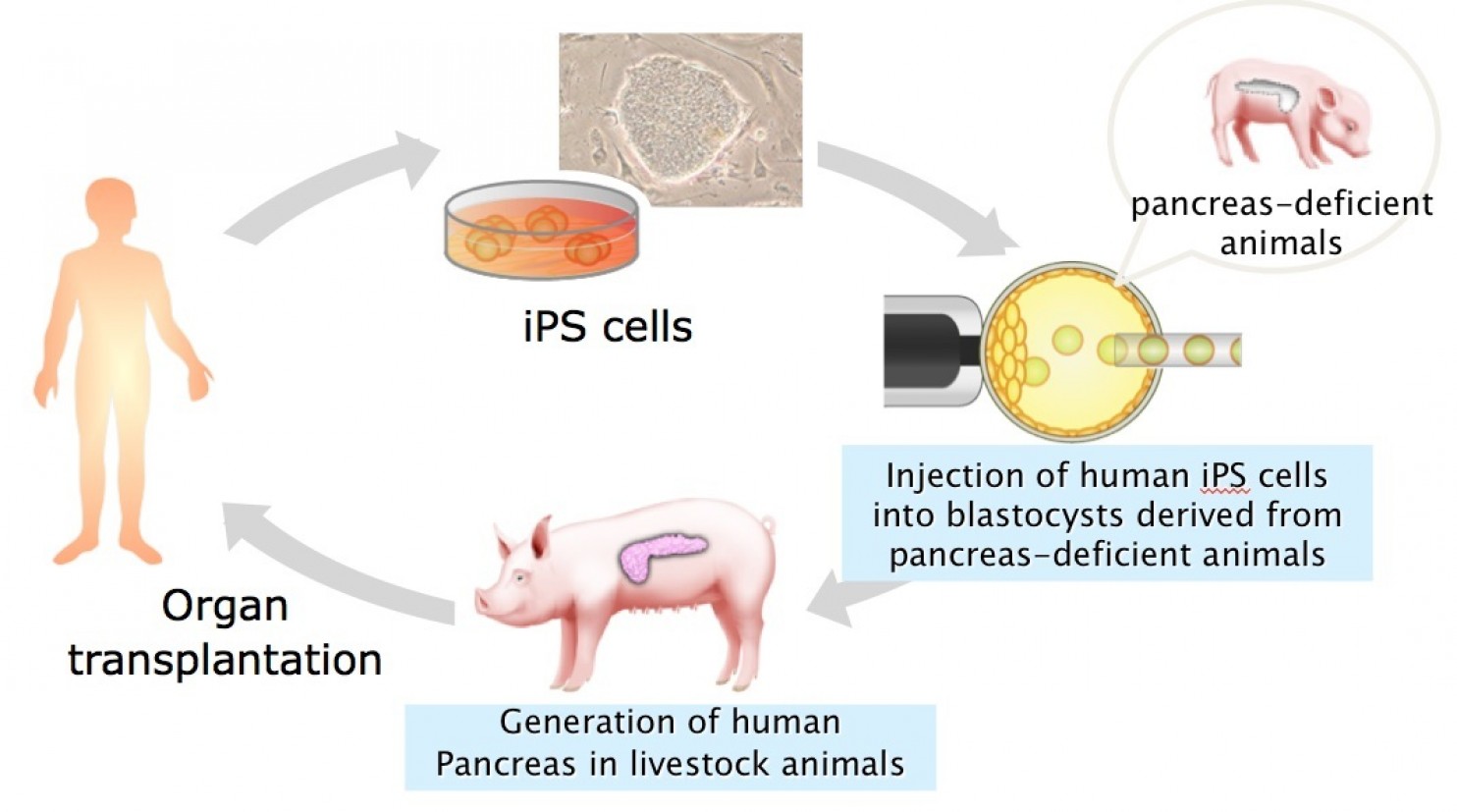 An illustration of a potential process for harvesting human organs from pigs using chimera embryos. (Hiro Nakauchi)