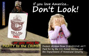 CUE TWILIGHT ZONE MUSIC: A NYC artist called Lmnopi (Lopi LaRoe) has been ordered by an agency of the US Government to Cease and Desist causing harm to them(*) by infringing their intellectual property rights, to wit, using the SMOKEY THE BEAR icon in this anti-fracking parody. "Only YOU can Prevent Faucet Fires". This image has gone viral on the internet, and causes many people laugh, see it as brilliant parody, and also see the important call-to-action. Also, isn't it the mission … [Read more...] about If you Love America… AVERT YOUR EYES!