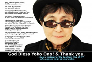 The people who support fracking, call Yoko Ono a "downstate blue-blood". How many people know she is also an affected landowner? She lives part-time in upstate NY. Now here's the thing frackers should know about Yoko.... To most of us, Yoko has unimaginable wealth. Yet, despite her wealth, she has NO SPECIAL RIGHTS or PROTECTIONS against the pipeline proposed to run through her back yard. Do you see the irony here? All of the people who support fracking want … [Read more...] about Here’s the thing frackers should know about Yoko Ono…